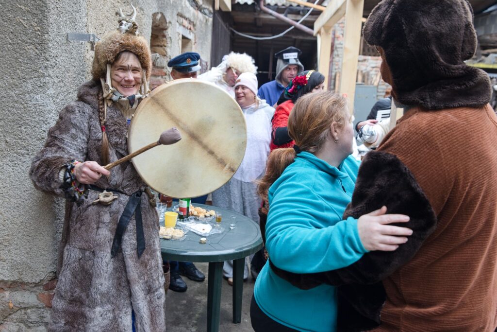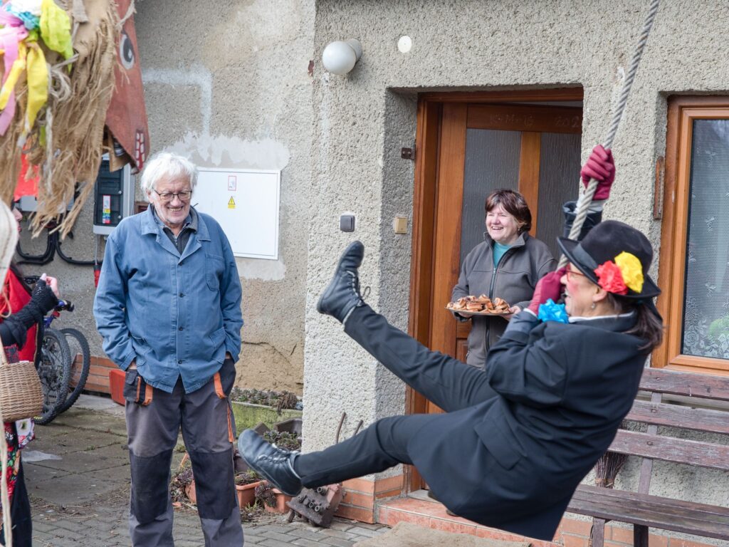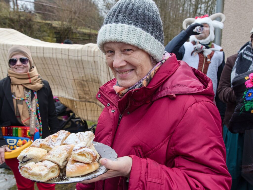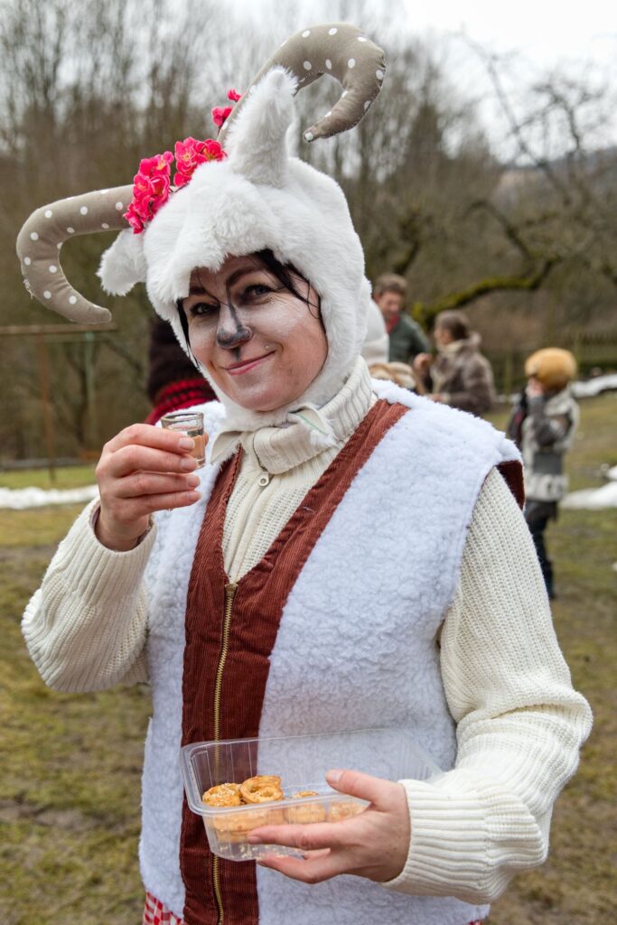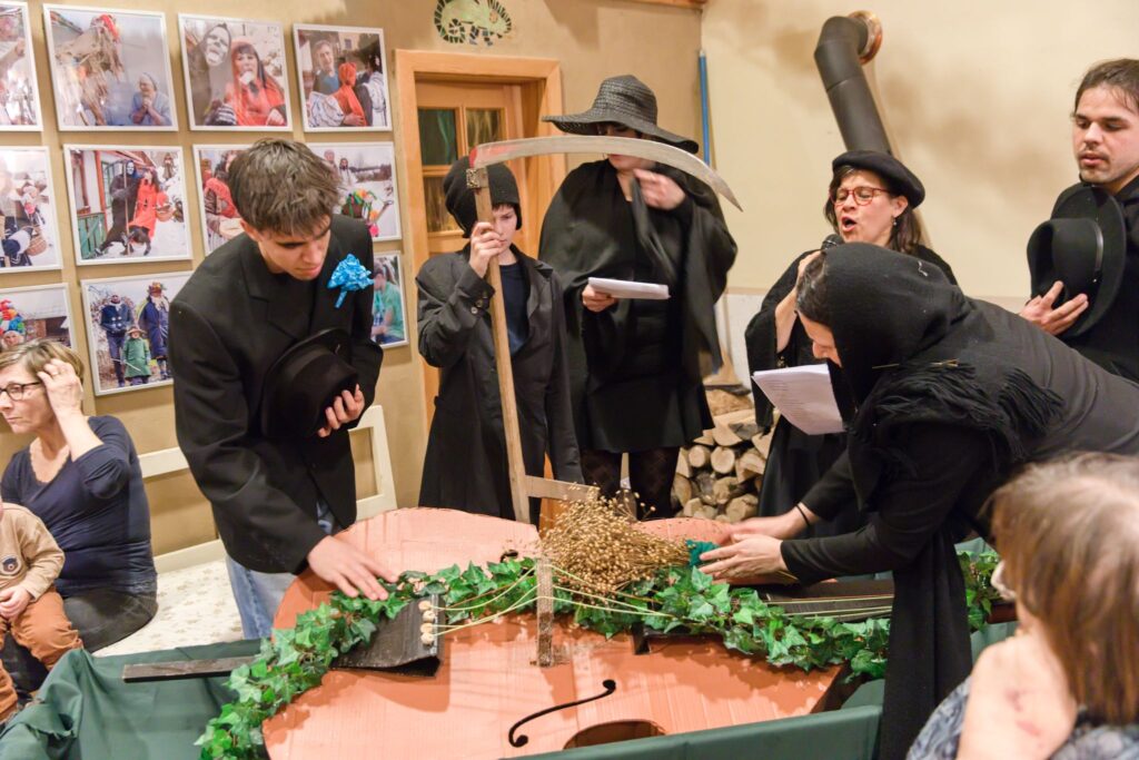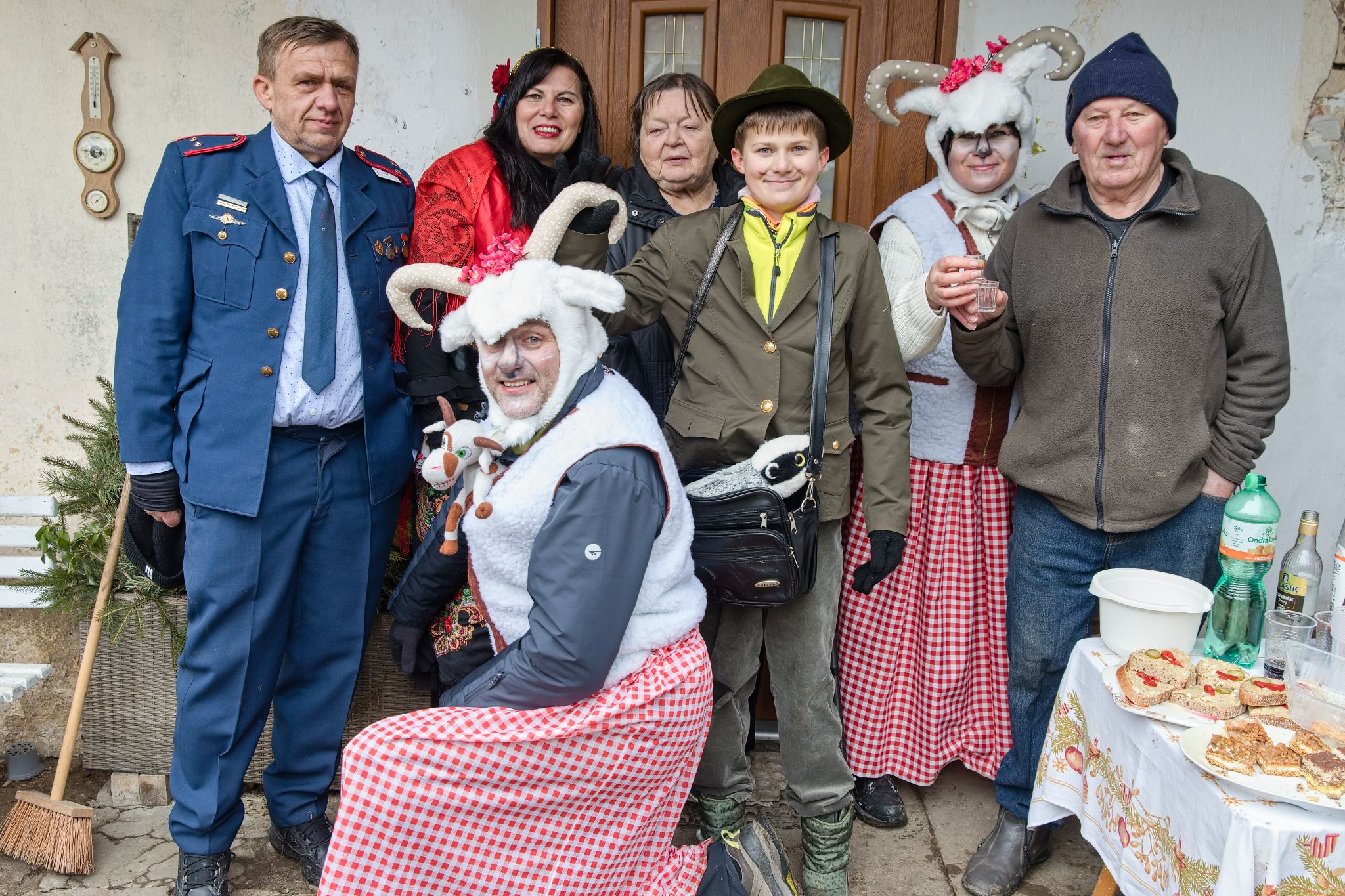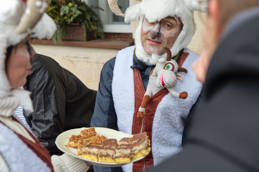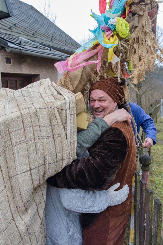 Sousedé a sousedky na oplátku pro masopustní maškary nachystali bohaté občerstvení a něco přidali na vůz k večernímu pohoštění ve Spolkovně. Tam jsme se všichni sešli po krátkém odpočinku.