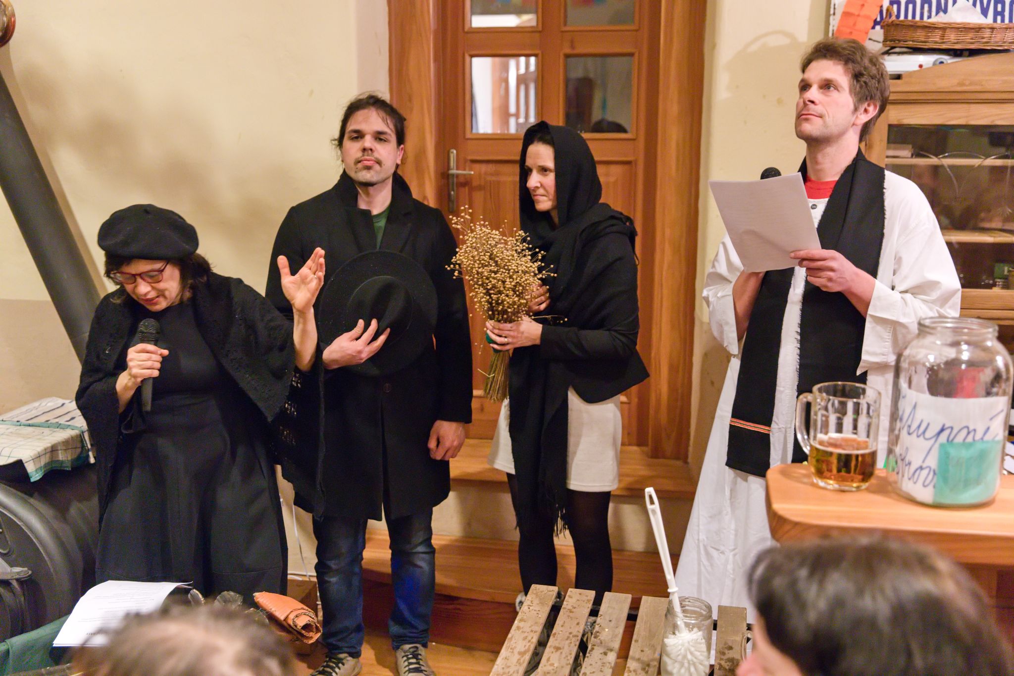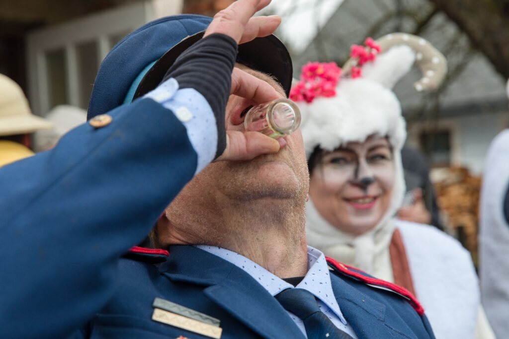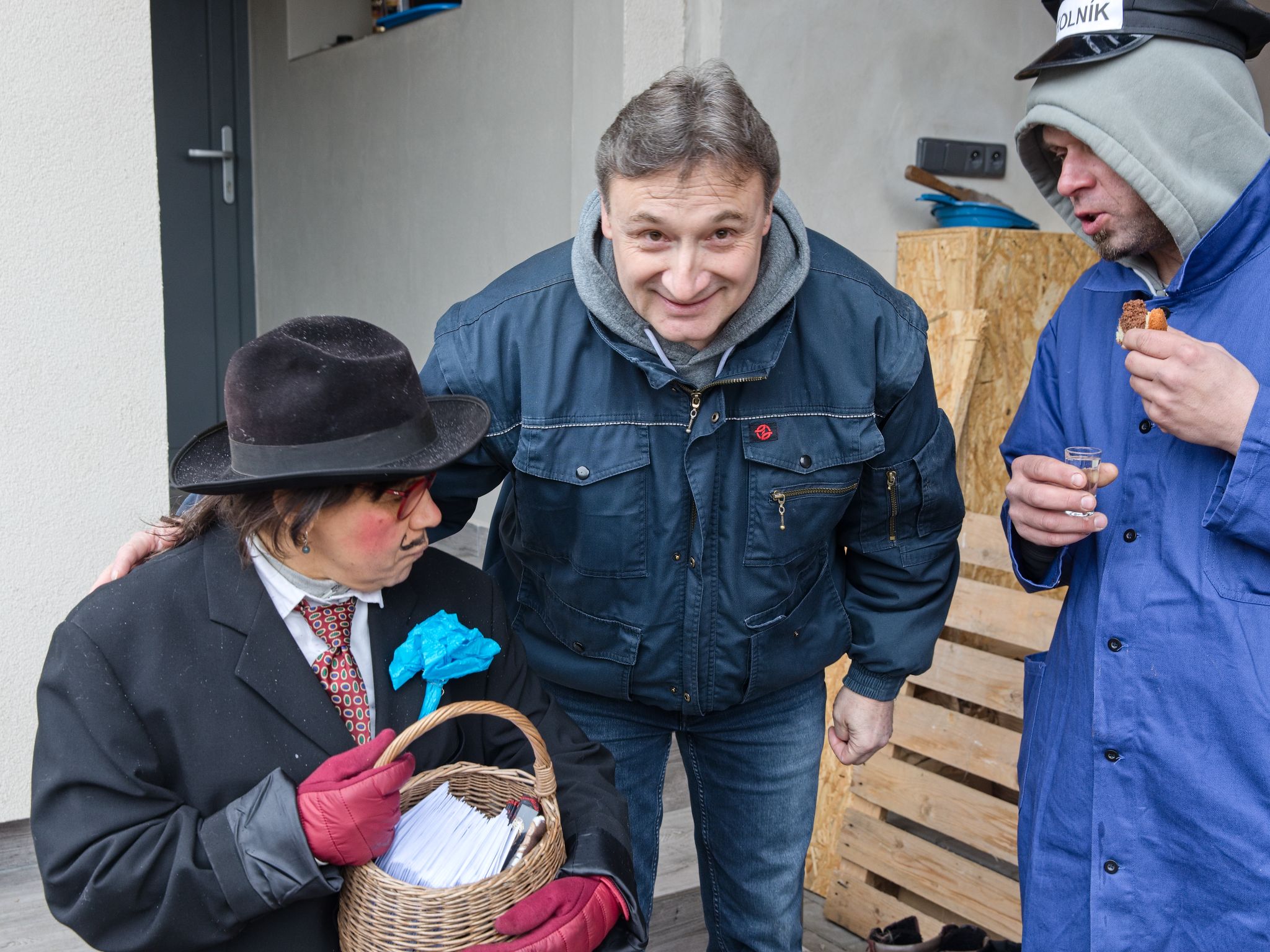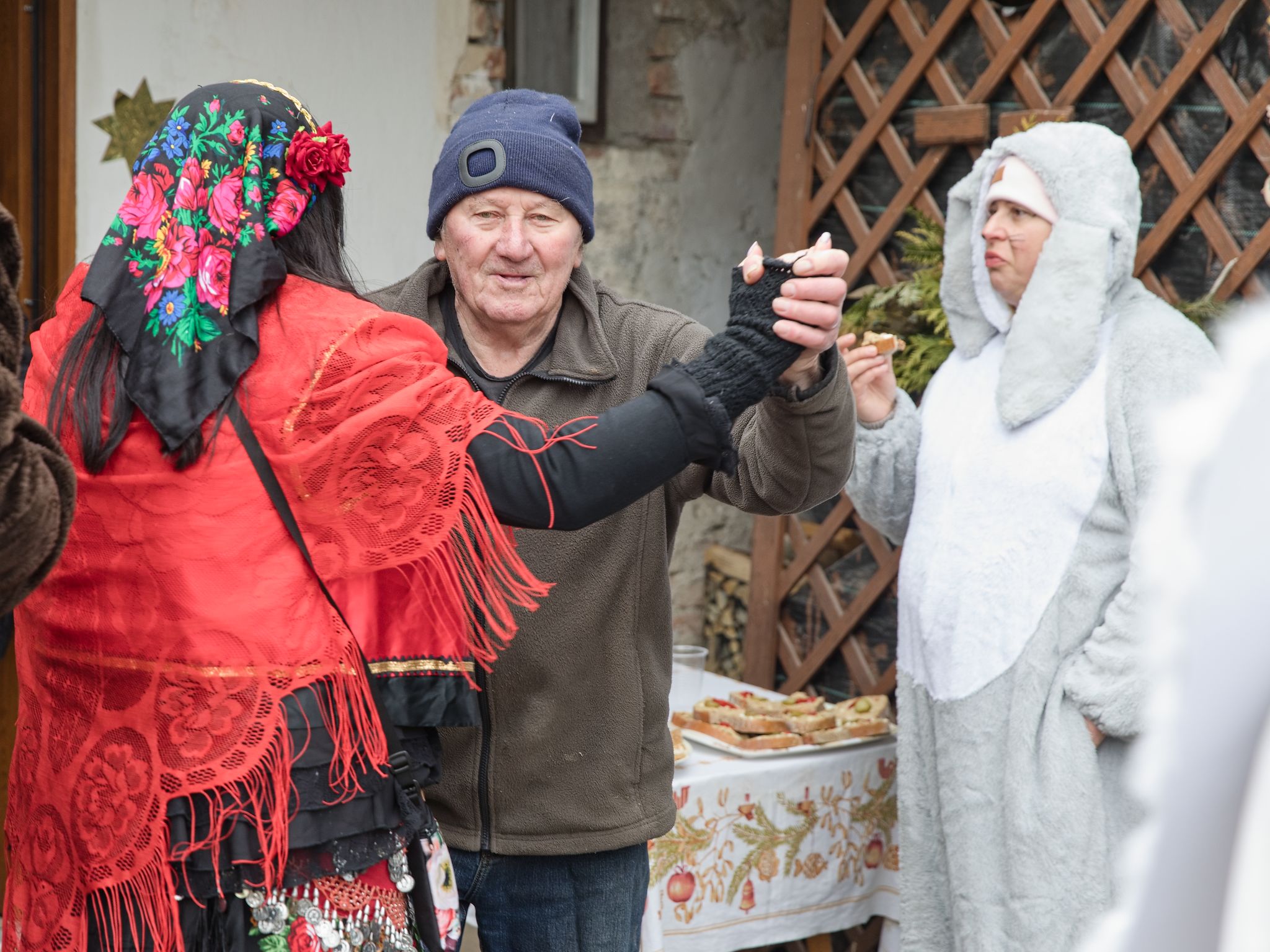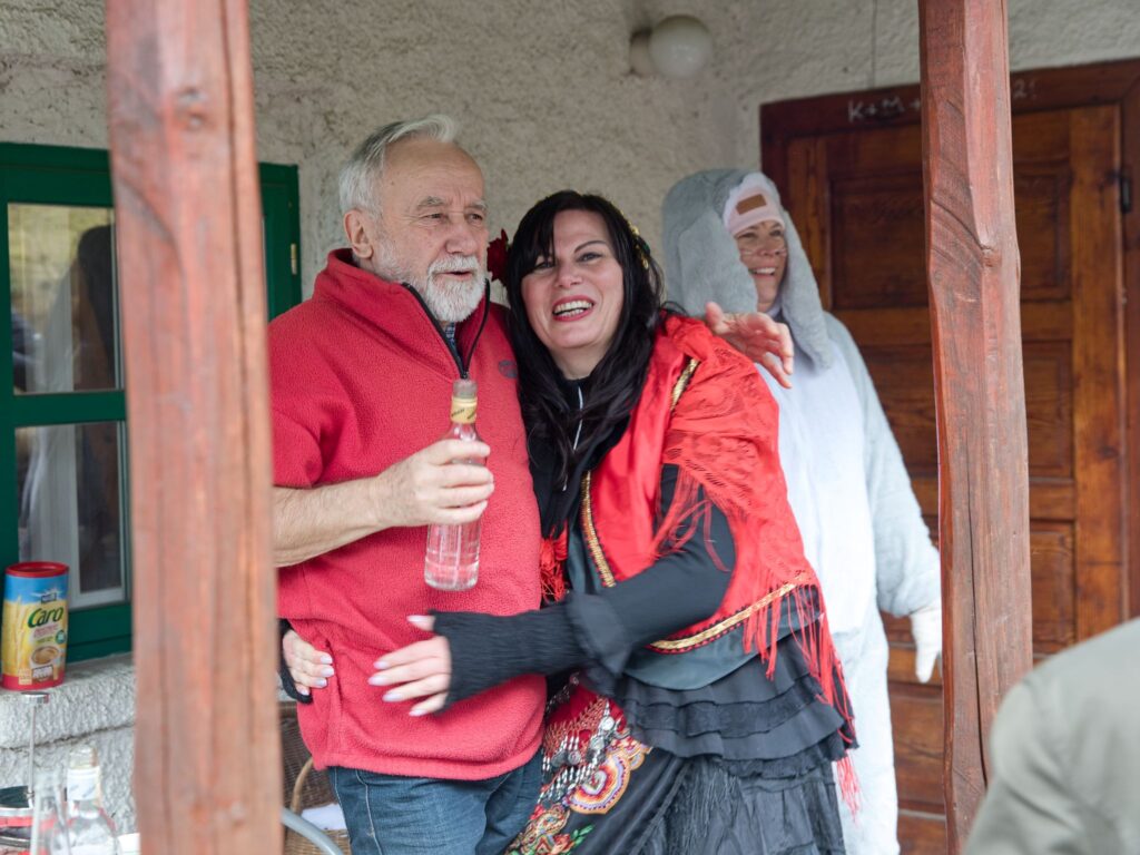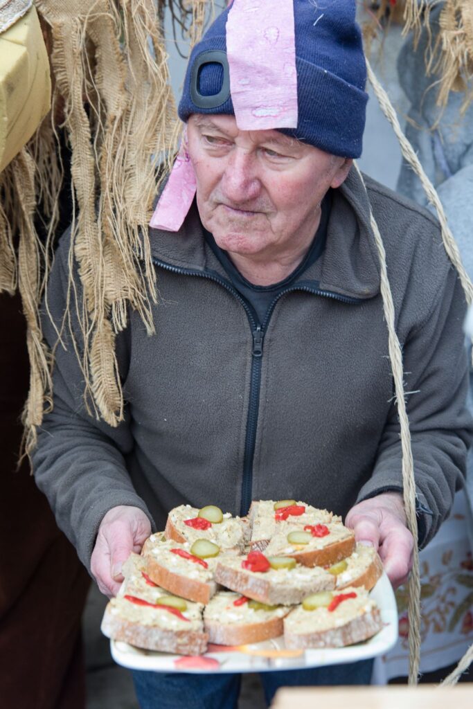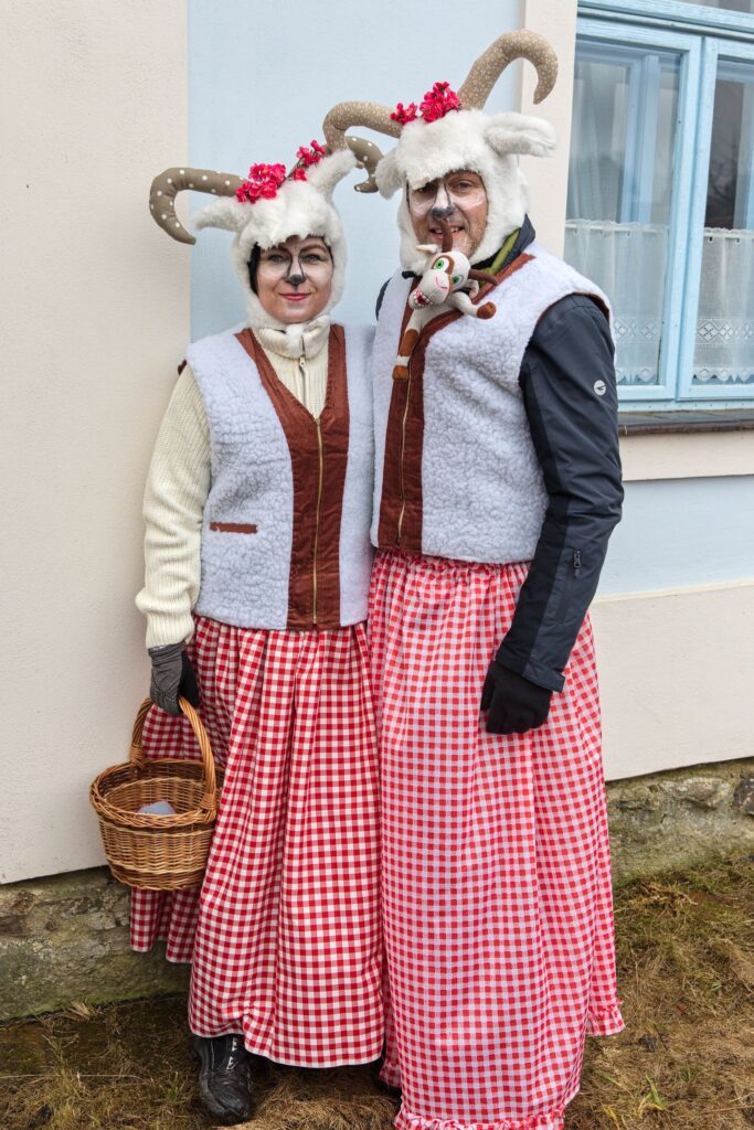 Sousedé a sousedky na oplátku pro masopustní maškary nachystali bohaté občerstvení a něco přidali na vůz k večernímu pohoštění ve Spolkovně. Tam jsme se všichni sešli po krátkém odpočinku.